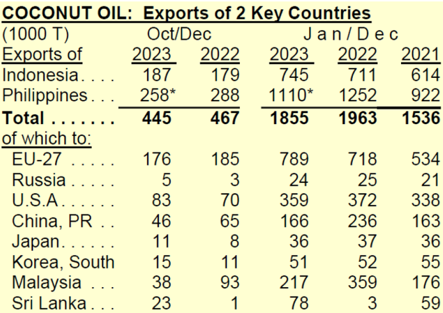 2023년 필리핀과 말레이시아의 합친 코코넛 오일 수출량은 1.86백만톤으로 6% 감소하였습니다. 그러나 이는 여전히 지난 13년 동안 두 번째로 높은 수준입니다. 지난 12개월 동안 비교적 많은 수출 공급량과 수요 감소가 다른 식물성 오일에 비해 코코넛 오일의 강한 가격 경쟁력을 유지하였습니다.
