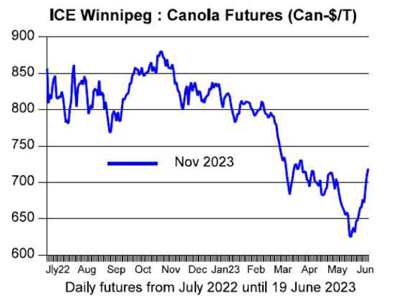 Alberta 주 남부와 Saskatchewan 주의 여러 지역에서 건조 날씨는 금주 시작점에 캐나다 canola 가격을 지지했습니다. 6월 19일 마감시에, new-crop(11월 포지션) 선물은 718.80캐나다$로 뛰어올랐습니다(1주일 전으로부터 8% 상승이고 4월 4일 이후 최고 수준).